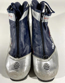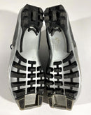 Boots are the most obviously distinctive family of nordic ski boots. They have a 75mm wide "duck bill" at the front of the boot, with three holes on the bottom of the bill that line up with the pins on their appropriate binding.