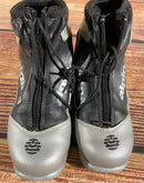 Boots are the most obviously distinctive family of nordic ski boots. They have a 75mm wide "duck bill" at the front of the boot, with three holes on the bottom of the bill that line up with the pins on their appropriate binding.