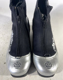 Boots are the most obviously distinctive family of nordic ski boots. They have a 75mm wide "duck bill" at the front of the boot, with three holes on the bottom of the bill that line up with the pins on their appropriate binding.