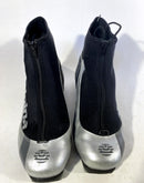 Boots are the most obviously distinctive family of nordic ski boots. They have a 75mm wide "duck bill" at the front of the boot, with three holes on the bottom of the bill that line up with the pins on their appropriate binding.