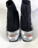 Boots are the most obviously distinctive family of nordic ski boots. They have a 75mm wide "duck bill" at the front of the boot, with three holes on the bottom of the bill that line up with the pins on their appropriate binding.