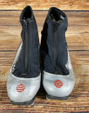 Boots are the most obviously distinctive family of Nordic ski boots. They have a 75mm wide "duck bill" at the front of the boot, with three holes on the bottom of the bill that line up with the pins on their appropriate binding.