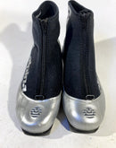 Boots are the most obviously distinctive family of nordic ski boots. They have a 75mm wide "duck bill" at the front of the boot, with three holes on the bottom of the bill that line up with the pins on their appropriate binding.