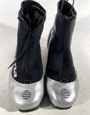 Boots are the most obviously distinctive family of nordic ski boots. They have a 75mm wide "duck bill" at the front of the boot, with three holes on the bottom of the bill that line up with the pins on their appropriate binding.