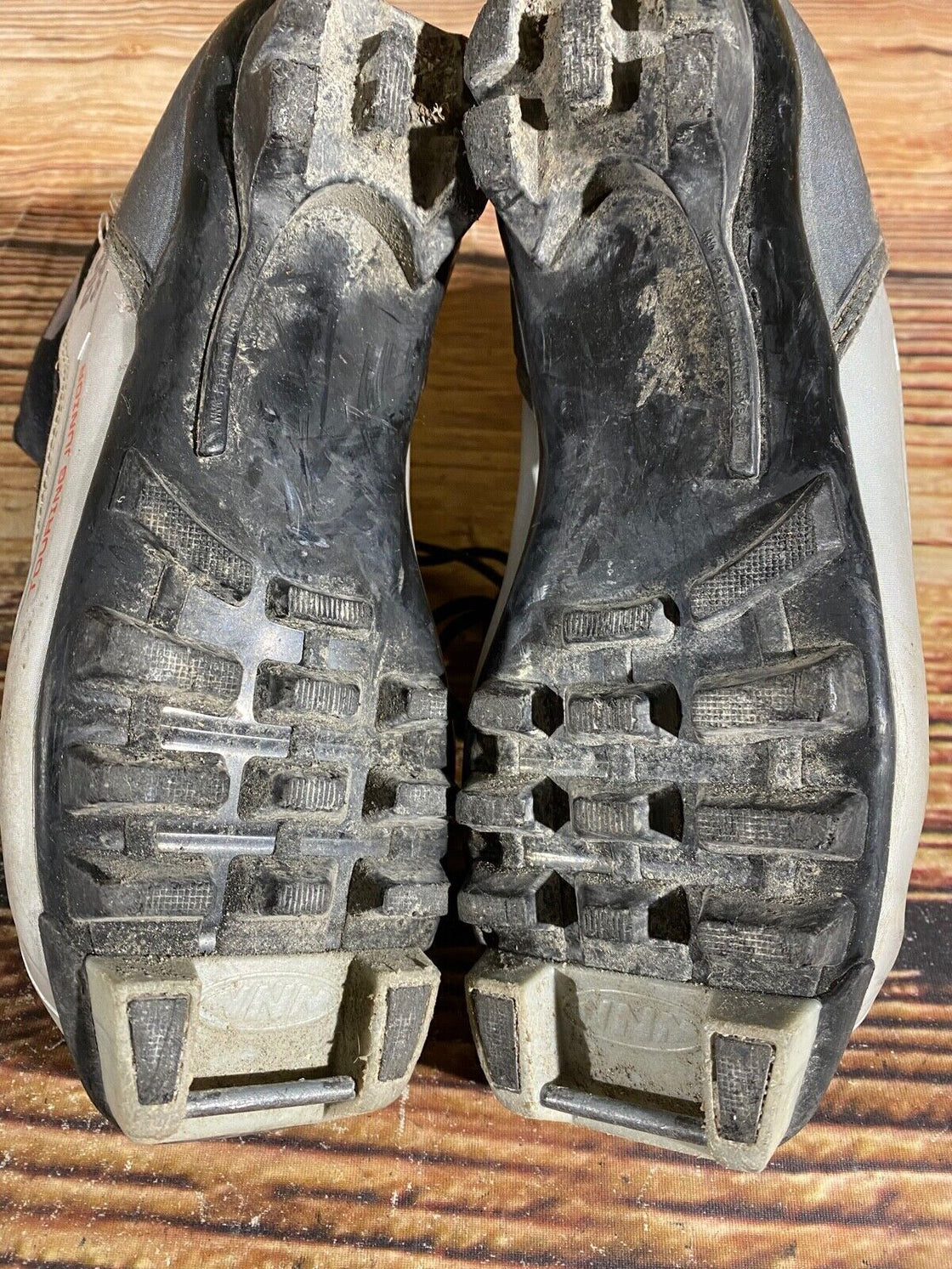 Boots are the most obviously distinctive family of nordic ski boots. They have a 75mm wide "duck bill" at the front of the boot, with three holes on the bottom of the bill that line up with the pins on their appropriate binding.