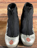 Boots are the most obviously distinctive family of nordic ski boots. They have a 75mm wide "duck bill" at the front of the boot, with three holes on the bottom of the bill that line up with the pins on their appropriate binding.
