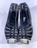 Boots are the most obviously distinctive family of nordic ski boots. They have a 75mm wide "duck bill" at the front of the boot, with three holes on the bottom of the bill that line up with the pins on their appropriate binding.