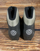 Boots are the most obviously distinctive family of nordic ski boots. They have a 75mm wide "duck bill" at the front of the boot, with three holes on the bottom of the bill that line up with the pins on their appropriate binding.