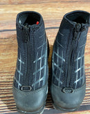 Boots are the most obviously distinctive family of nordic ski boots. They have a 75mm wide "duck bill" at the front of the boot, with three holes on the bottom of the bill that line up with the pins on their appropriate binding.