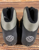 Boots are the most obviously distinctive family of nordic ski boots. They have a 75mm wide "duck bill" at the front of the boot, with three holes on the bottom of the bill that line up with the pins on their appropriate binding.