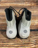 Boots are the most obviously distinctive family of nordic ski boots. They have a 75mm wide "duck bill" at the front of the boot, with three holes on the bottom of the bill that line up with the pins on their appropriate binding.
