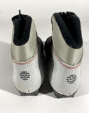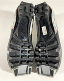 Boots are the most obviously distinctive family of nordic ski boots. They have a 75mm wide "duck bill" at the front of the boot, with three holes on the bottom of the bill that line up with the pins on their appropriate binding.