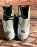 Boots are the most obviously distinctive family of nordic ski boots. They have a 75mm wide "duck bill" at the front of the boot, with three holes on the bottom of the bill that line up with the pins on their appropriate binding.