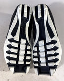 Boots are the most obviously distinctive family of nordic ski boots. They have a 75mm wide "duck bill" at the front of the boot, with three holes on the bottom of the bill that line up with the pins on their appropriate binding.