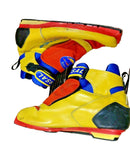 Boots are the most obviously distinctive family of nordic ski boots. They have a 75mm wide "duck bill" at the front of the boot, with three holes on the bottom of the bill that line up with the pins on their appropriate binding.