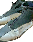 Boots are the most obviously distinctive family of nordic ski boots. They have a 75mm wide "duck bill" at the front of the boot, with three holes on the bottom of the bill that line up with the pins on their appropriate binding.