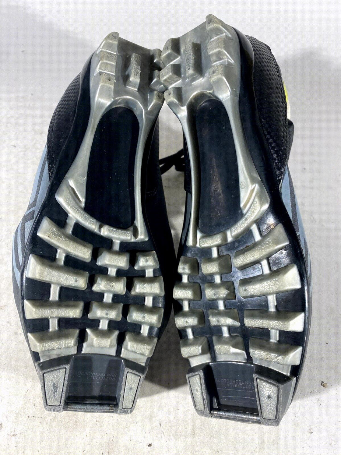 Boots are the most obviously distinctive family of nordic ski boots. They have a 75mm wide "duck bill" at the front of the boot, with three holes on the bottom of the bill that line up with the pins on their appropriate binding.