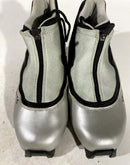 Boots are the most obviously distinctive family of nordic ski boots. They have a 75mm wide "duck bill" at the front of the boot, with three holes on the bottom of the bill that line up with the pins on their appropriate binding.