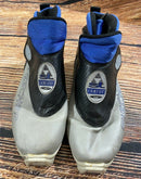 Boots are the most obviously distinctive family of nordic ski boots. They have a 75mm wide "duck bill" at the front of the boot, with three holes on the bottom of the bill that line up with the pins on their appropriate binding.
