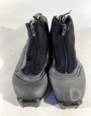 Boots are the most obviously distinctive family of nordic ski boots. They have a 75mm wide "duck bill" at the front of the boot, with three holes on the bottom of the bill that line up with the pins on their appropriate binding.