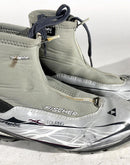 Boots are the most obviously distinctive family of nordic ski boots. They have a 75mm wide "duck bill" at the front of the boot, with three holes on the bottom of the bill that line up with the pins on their appropriate binding.