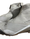 Boots are the most obviously distinctive family of nordic ski boots. They have a 75mm wide "duck bill" at the front of the boot, with three holes on the bottom of the bill that line up with the pins on their appropriate binding.