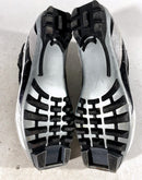 Boots are the most obviously distinctive family of nordic ski boots. They have a 75mm wide "duck bill" at the front of the boot, with three holes on the bottom of the bill that line up with the pins on their appropriate binding.