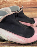 Boots are the most obviously distinctive family of nordic ski boots. They have a 75mm wide "duck bill" at the front of the boot, with three holes on the bottom of the bill that line up with the pins on their appropriate binding.