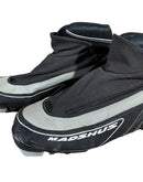 Boots are the most obviously distinctive family of nordic ski boots. They have a 75mm wide "duck bill" at the front of the boot, with three holes on the bottom of the bill that line up with the pins on their appropriate binding.