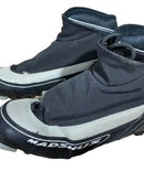 Boots are the most obviously distinctive family of Nordic ski boots. They have a 75mm wide "duck bill" at the front of the boot, with three holes on the bottom of the bill that line up with the pins on their appropriate binding.