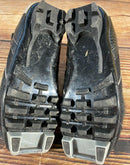 Boots are the most obviously distinctive family of nordic ski boots. They have a 75mm wide "duck bill" at the front of the boot, with three holes on the bottom of the bill that line up with the pins on their appropriate binding.