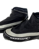 Boots are the most obviously distinctive family of nordic ski boots. They have a 75mm wide "duck bill" at the front of the boot, with three holes on the bottom of the bill that line up with the pins on their appropriate binding.