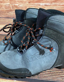 Boots are the most obviously distinctive family of nordic ski boots. They have a 75mm wide "duck bill" at the front of the boot, with three holes on the bottom of the bill that line up with the pins on their appropriate binding.