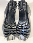 Boots are the most obviously distinctive family of nordic ski boots. They have a 75mm wide "duck bill" at the front of the boot, with three holes on the bottom of the bill that line up with the pins on their appropriate binding.