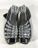 Boots are the most obviously distinctive family of nordic ski boots. They have a 75mm wide "duck bill" at the front of the boot, with three holes on the bottom of the bill that line up with the pins on their appropriate binding.
