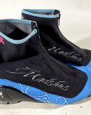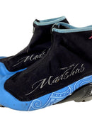 Boots are the most obviously distinctive family of nordic ski boots. They have a 75mm wide "duck bill" at the front of the boot, with three holes on the bottom of the bill that line up with the pins on their appropriate binding.