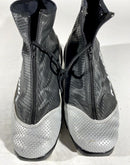 Boots are the most obviously distinctive family of nordic ski boots. They have a 75mm wide "duck bill" at the front of the boot, with three holes on the bottom of the bill that line up with the pins on their appropriate binding.