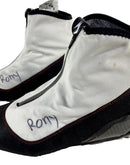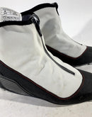 Boots are the most obviously distinctive family of nordic ski boots. They have a 75mm wide "duck bill" at the front of the boot, with three holes on the bottom of the bill that line up with the pins on their appropriate binding.