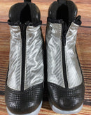 Boots are the most obviously distinctive family of nordic ski boots. They have a 75mm wide "duck bill" at the front of the boot, with three holes on the bottom of the bill that line up with the pins on their appropriate binding.