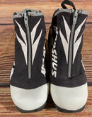 Boots are the most obviously distinctive family of nordic ski boots. They have a 75mm wide "duck bill" at the front of the boot, with three holes on the bottom of the bill that line up with the pins on their appropriate binding.