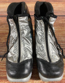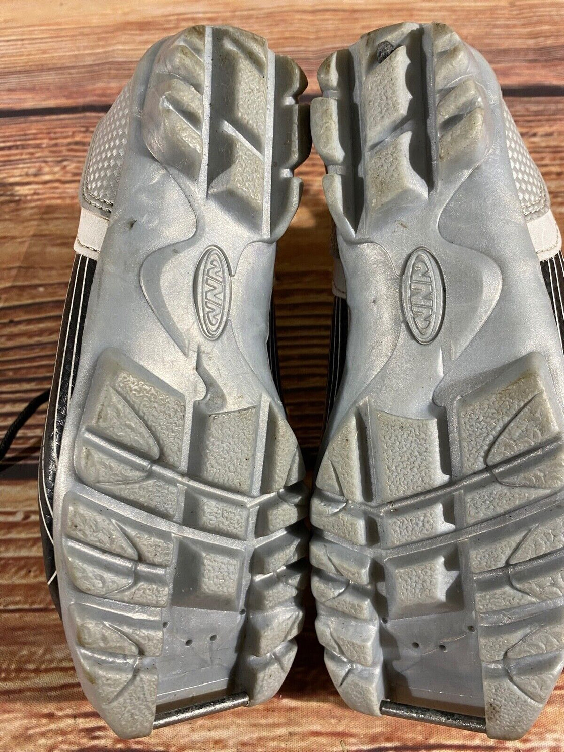 Boots are the most obviously distinctive family of nordic ski boots. They have a 75mm wide "duck bill" at the front of the boot, with three holes on the bottom of the bill that line up with the pins on their appropriate binding.