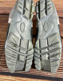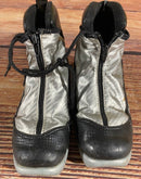 Boots are the most obviously distinctive family of nordic ski boots. They have a 75mm wide "duck bill" at the front of the boot, with three holes on the bottom of the bill that line up with the pins on their appropriate binding.