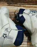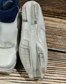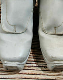 Boots are the most obviously distinctive family of nordic ski boots. They have a 75mm wide "duck bill" at the front of the boot, with three holes on the bottom of the bill that line up with the pins on their appropriate binding.