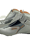 Boots are the most obviously distinctive family of nordic ski boots. They have a 75mm wide "duck bill" at the front of the boot, with three holes on the bottom of the bill that line up with the pins on their appropriate binding.