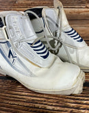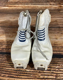 Boots are the most obviously distinctive family of nordic ski boots. They have a 75mm wide "duck bill" at the front of the boot, with three holes on the bottom of the bill that line up with the pins on their appropriate binding.