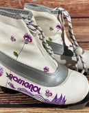 Boots are the most obviously distinctive family of nordic ski boots. They have a 75mm wide "duck bill" at the front of the boot, with three holes on the bottom of the bill that line up with the pins on their appropriate binding.