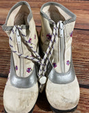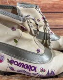 Boots are the most obviously distinctive family of nordic ski boots. They have a 75mm wide "duck bill" at the front of the boot, with three holes on the bottom of the bill that line up with the pins on their appropriate binding.