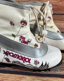 Boots are the most obviously distinctive family of nordic ski boots. They have a 75mm wide "duck bill" at the front of the boot, with three holes on the bottom of the bill that line up with the pins on their appropriate binding.