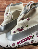 Boots are the most obviously distinctive family of nordic ski boots. They have a 75mm wide "duck bill" at the front of the boot, with three holes on the bottom of the bill that line up with the pins on their appropriate binding.