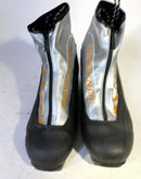 Boots are the most obviously distinctive family of nordic ski boots. They have a 75mm wide "duck bill" at the front of the boot, with three holes on the bottom of the bill that line up with the pins on their appropriate binding.